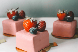 Ecco qualche spunto creativo: una mousse ai frutti rossi con inserto al lampone e glassa lucida rosa; un entremets al pistacchio e fiori d’arancio, con finiture leggere effetto velluto; tartellette con crema alla vaniglia e frutta fresca disposta a petalo.